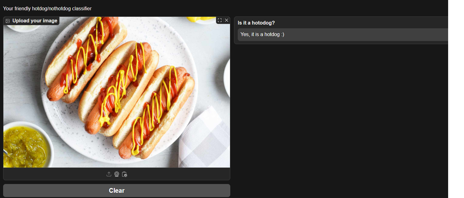 - Inspired by Jian Yang’s (Silicon Valley) stellar idea, built a ResNet18-powered image classification model in PyTorch, fine-tuned for binary (hotdog/not hotdog) classification.